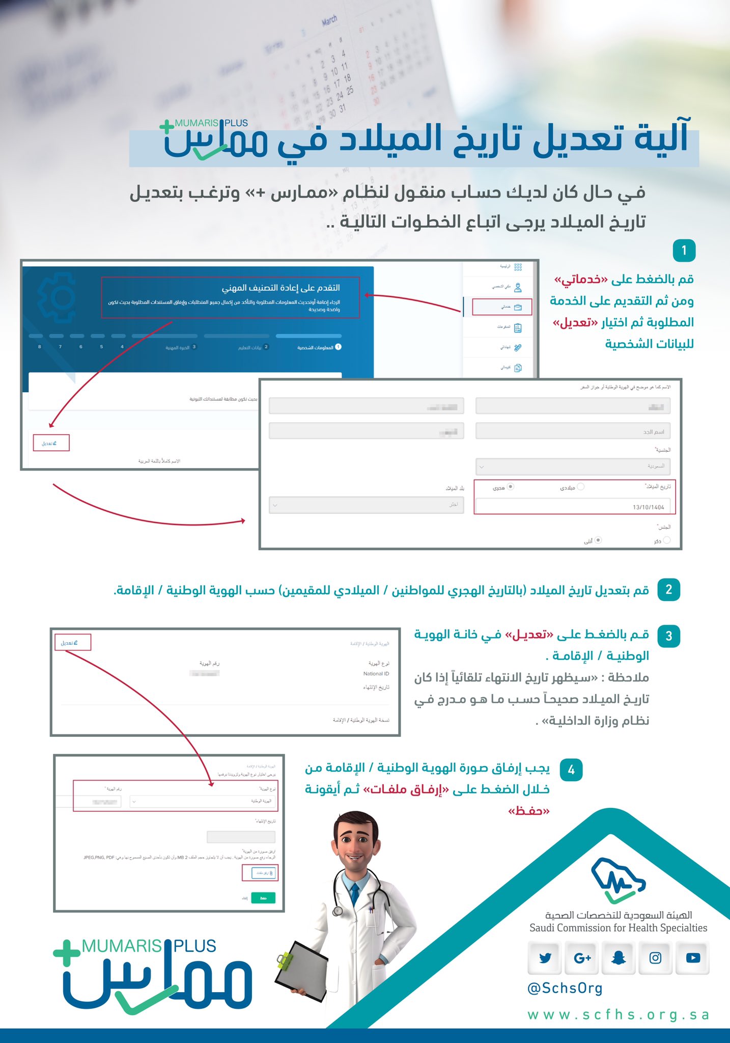 هـ يـ ئـ ة الـ تـ خـ صـ صـ ا ت الـ صـ حـ يـ ة On Twitter هيئة التخصصات الصحية انفوجرافيك آلية تعديل تاريخ الميلاد في ممارس بلس