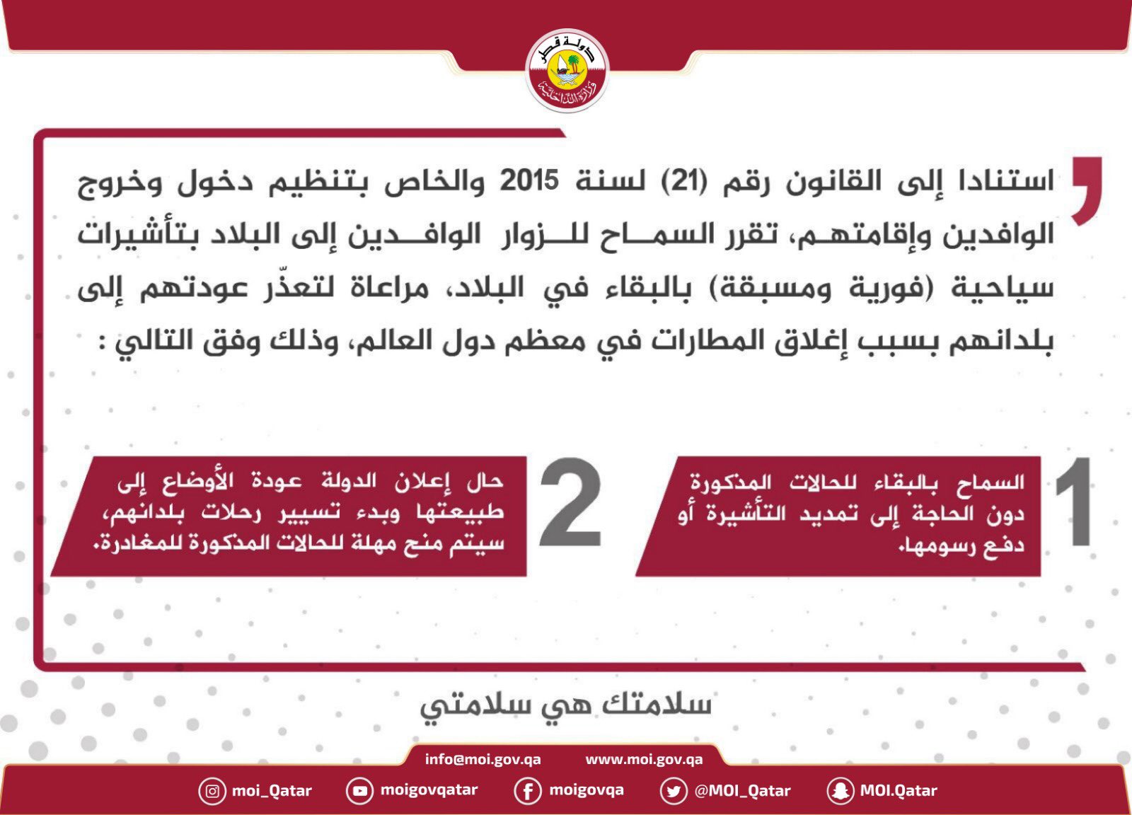 وزارة الداخلية قطر Twitterissa استنادا إلى القانون رقم ۲۱ لسنة ٢٠١٥ والخاص بتنظيم دخول وخروج الوافدين وإقامتهم تقرر السماح للزوار الوافدين إلى البلاد بتأشيرات سياحية فورية ومسبقة بالبقاء في البلاد مراعاة